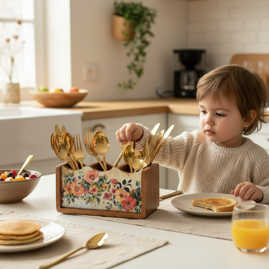 Premium Wooden Pastel Flora Cutlery Holder Spoon stand for kitchen | cutlery holder for dining table | wooden caddy storage organiser stand with 3 section Caddy holder (8.2x4.2x4 inch)